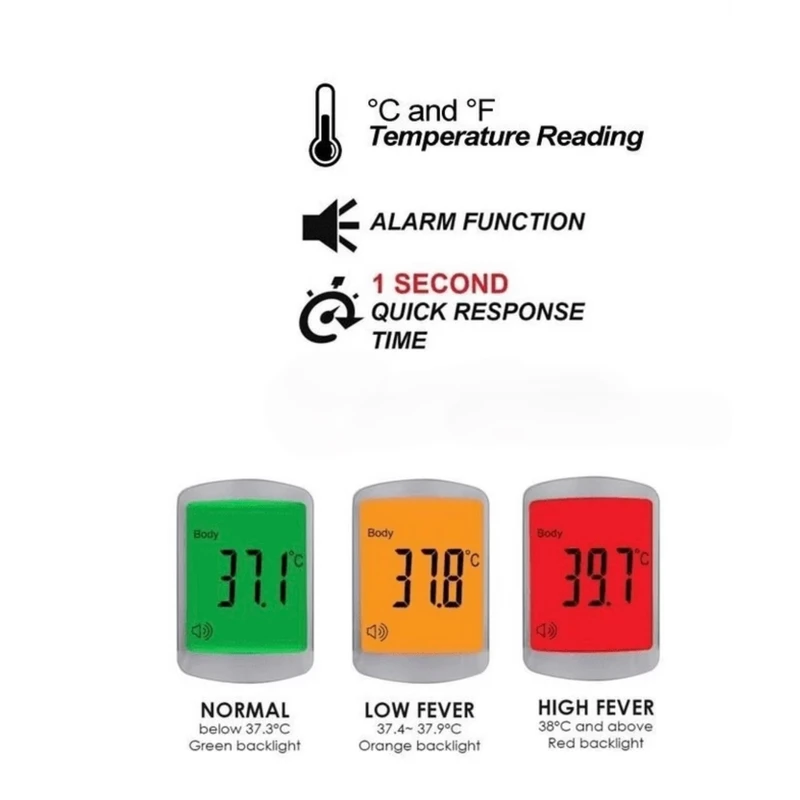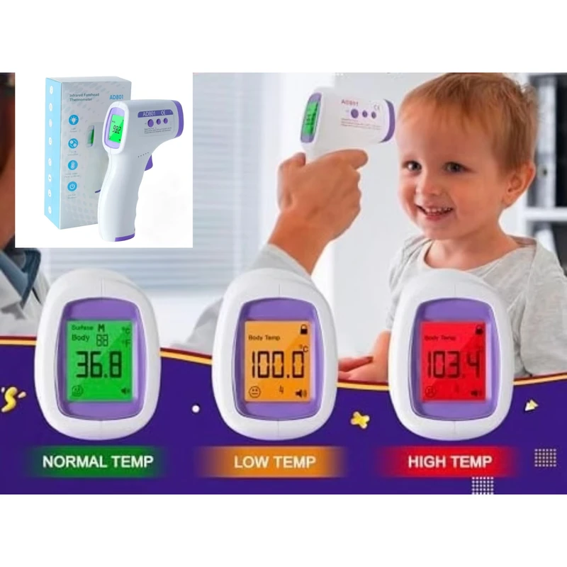 این تب سنج دیجیتال بدون تماس قابلیت سنجش دمای بدن، دمای محیط و دمای سطح را دارد. برای این تب سنج سنسور فاصله تعبیه شده تا بدون نیاز به تماس، بتوانید دمای بدن افراد به خصوص نوزادان و کودکان را اندازه گیری کنید. این تب سنج دمای بدن را با چراغ LED به شما هشدار می دهد. بدین صورت که طبیعی را با چراغ سبز، دمای بالا را با چراغ قرمز و تب خفیف و پایین را با رنگ نارنجی نمایان می شود. سیستم اندازه گیری دمای این تب سنج با مادون قرمز بوده و سریعا دما را اندازه گیری کرده. تب سنج دیجیتال مدل AD801 دما را به صورت فارنهایت و سانتی گراد نشان می دهد. این تب سنج دما را از فاصله ی 3 تا 5 سانتی متری اندازه گیری می کند. همچنین دارای جایگاه حافظه می باشد که می توانید دمای بدن را ذخیره کنید. باید توجه داشته باشیداگر روی پیشانی مو، عرق یا گرد و غبار وجود دارد، به منظور بهبود دقت تمیز کرده و پاک کنید. دیگر نکته مهمی که می توان به آن اشاره کرد این است که دستگاه و فردی که دمای بدن آن میخواهد اندازه گیری شود، هردو باید حداقل 5 دقیقه در دمای محیط قرار گرفته باشند. بطور مثال تب سنج در یک کمد سرد قرار نگرفته و بلافاصه از آن استفاده نشود. باتری ها را در خلاف جهت یکدیگر قرار دهید به علامت مثبت و منفی هنگامی که درب محل قرار گیری باتری را باز میکنید دقت کنید