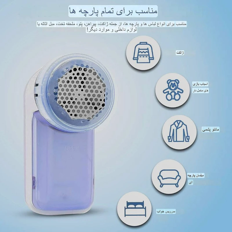 منبع تغذیه 2عدد باتریپرزگیری انواع لباس هااستفاده دوباره لباس ها قدیمیمخزن دارپرزگیر لباس shaving cutter 2802:شاید برای شماهم پیش آمده باشد که مدتی پس از استفاده از بعضی لباس ها،شروع به پرز شدن می کنند.کار این دستگاه پرز گیری لباس ها و پارچه هایی است که هنوز هم برای پوشیدن زیبا هستند اما به خاطر پرز شدن دیگر قابل استفاده نیستند.با استفاده از این دستگاه می توانید لباس هایتان قدیمیتان را دوباره استفاده کنید.منبع تغذیه این دستگاه دو عدد باتری است که به راحتی قابل حمل و استفاده است.