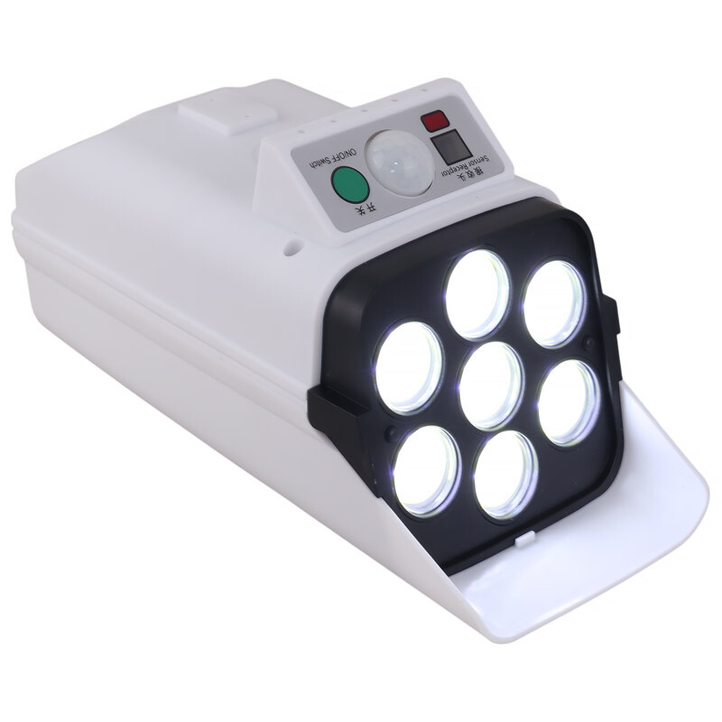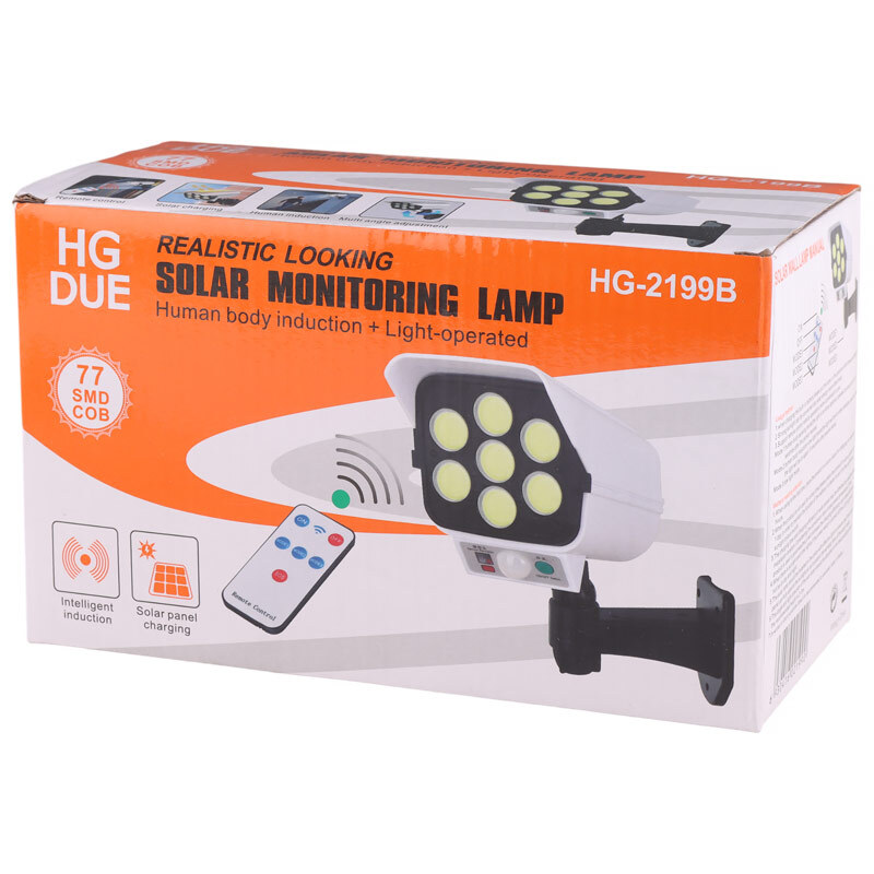چراغ دیواری سنسوردار خورشیدی طرح دوربین مدار بسته Hgdue HG-2199B + ریموت کنترلچراغ سولار هوشمند دیواری سنسوردار Hgdue مدل HG-2199B با پنل شارژ خورشیدی و ریموت کنترلبدنه ساخته شده از جنس پلاستیک با کیفیت و مقاوم در برابر فشار و ضربه احتمالیمجهز به 77 عدد لامپ SMD COB با سه حالت نوردهی مهتابی، مجهز به ریموت کنترلدارای کلید فیزیکی تعبیه شده بر روی بدنه جهت روشن و خاموش کردن دستگاه و انتخاب حالت نوردهیبرخوردار از پنل خورشیدی تعبیه شده بر روی بدنه به منظور شارژ باتری داخلی، مجهر به سنسور حرکتی
